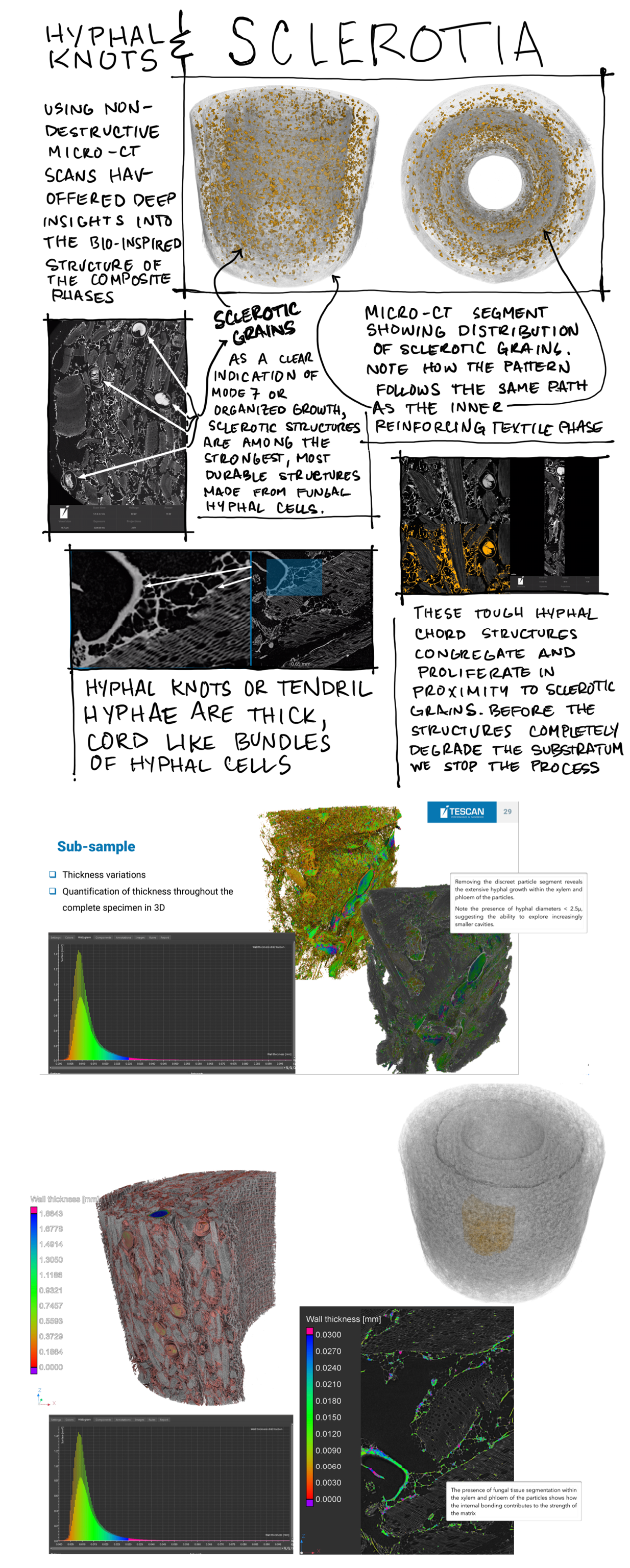 Incorporating a spiral of inner-reinforcing textile, as well as, a manifold textile outer fascia gives zerø-frm uniquely durable qualities among other mycelium based composite formulations.