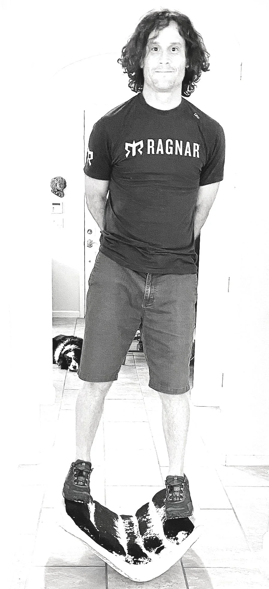 Inventor and okom wrks Principal Designer, Joshua English testing out the very first chair shell prototype, circa 2020. Photo Joshua English